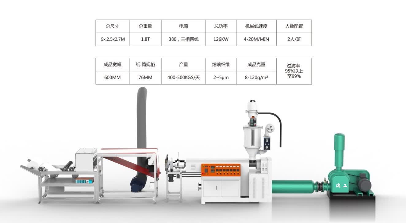 目前市場(chǎng)上面的設(shè)備大小生產(chǎn)線比較多,從300到3200mm寬幅都有,配置也是有很大的區(qū)別,熔噴布設(shè)備主要核心部件在于: ?羅茨鼓風(fēng)機(jī),空氣加熱器,自動(dòng)吸料烘干機(jī),單螺桿擠出機(jī),過(guò)濾器,熔體計(jì)量泵,噴絲模頭,接布臺(tái),靜電駐極機(jī),切布及卷布。
