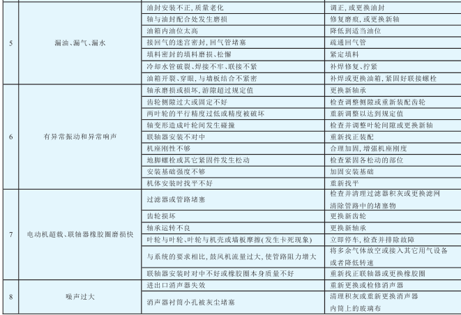 顯然,一臺羅茨風機,不管它設計、制造得如何優(yōu)良,由于零部件的正常磨損及其它客觀原因的影響,總有出現(xiàn)故障并需要維修的時候。何時維修合理,需要進行正確、準確的故障判斷。下圖為錦工羅茨風機總結的一些常見故障的原因分析及排除方法。