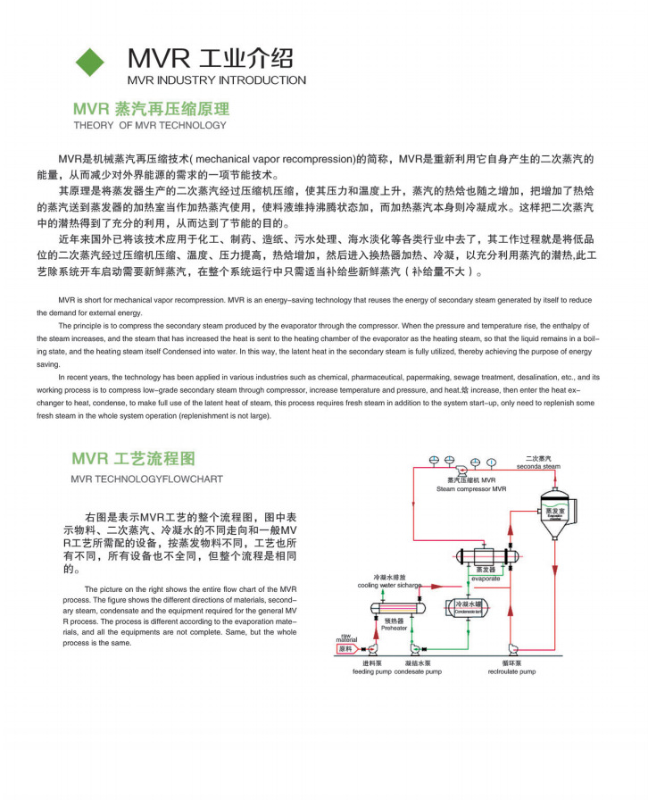MVR是機(jī)械蒸汽再壓縮技術(shù)(mechanical vapor recompression)的簡(jiǎn)稱,MVR是重新利用它自身產(chǎn)生的二次蒸汽的能置,從而減少對(duì)外界能源的需求的一項(xiàng)節(jié)能技術(shù)。