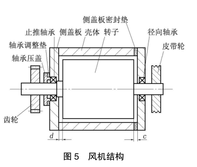 用塞尺法檢測轉(zhuǎn)子端面與機(jī)殼的軸向間隙。定位端( 齒輪側(cè))間隙d=0.1~0.2 mm,非定位端( 皮帶輪側(cè))間隙c=0.3~0.5 mm,總間隙的標(biāo)準(zhǔn)是 0.4~0.7mm。